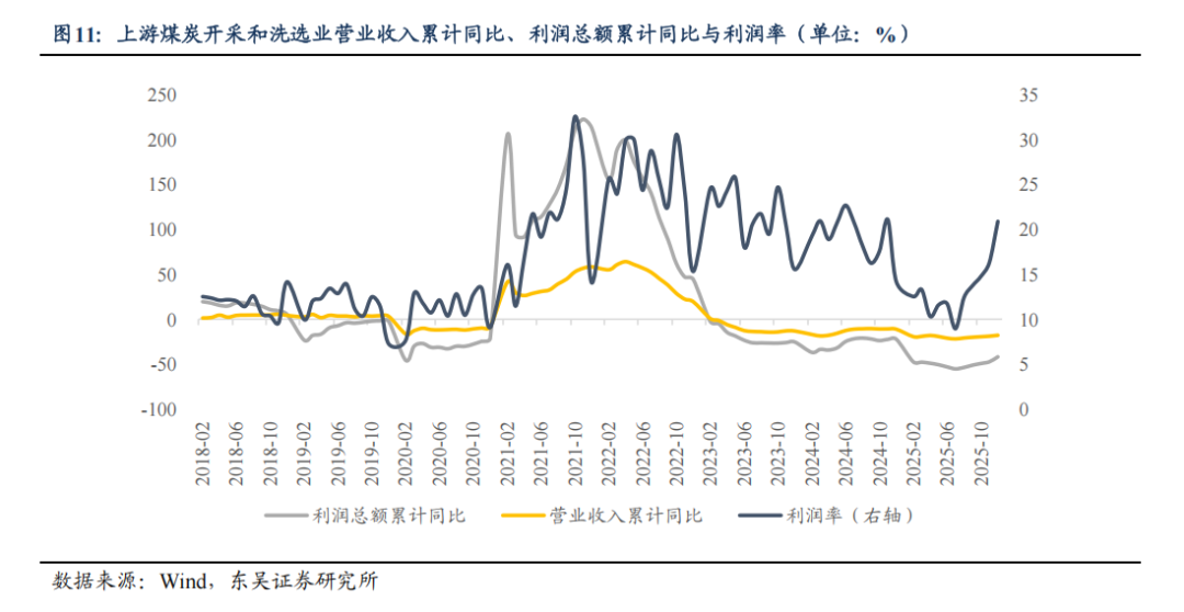 上游煤炭开采和洗选业行业直接受益于动力煤价格上涨,动力煤是火电生产的核心原料,需求刚性强。2018-2025年数据显示,煤炭价格上涨推动行业营业收入和利润总额增长,且煤炭开采和洗选业行业成本结构以固定资产折旧、人工成本为主,原材料占比低,与有色金属矿采选业盈利特征高度相似,价格上涨直接转化为收入、利润增长,是产业链利润提升的核心。总的来说,上游煤炭开采和洗选业凭借强需求刚性、稳定的成本结构、高价格传导效率,能够在物价回升周期中实现营收与利润的双高增长。