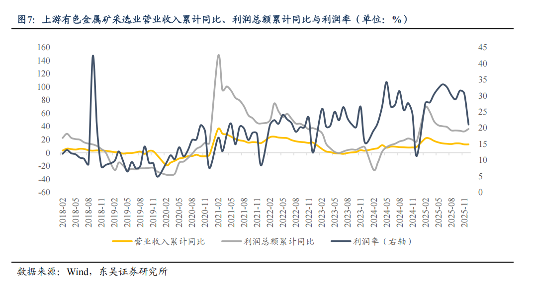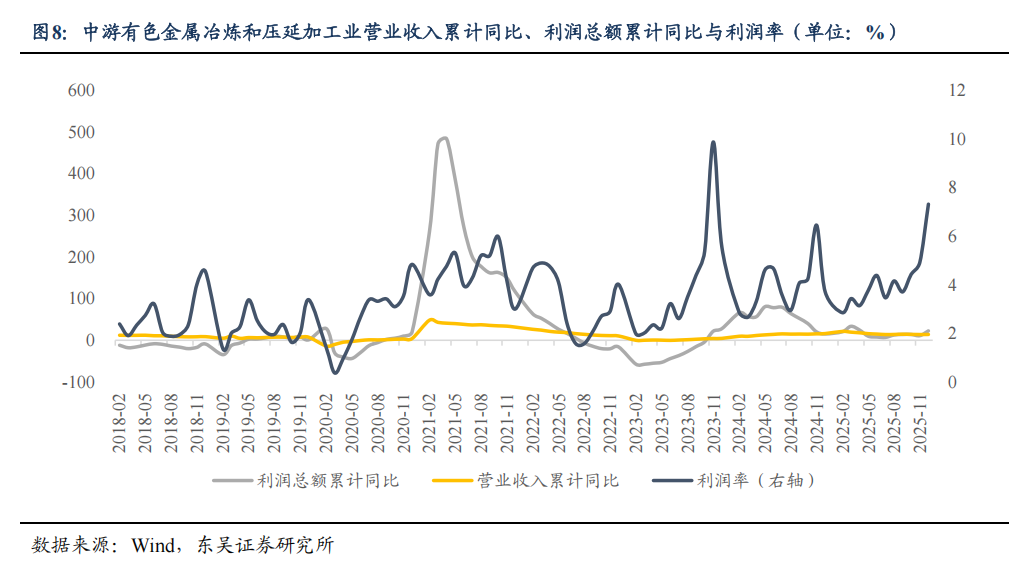 上游有色金属矿采选业作为产业链源头,直接受益于有色金属价格上涨。从图6、图7可见,上游利润总额累计同比与有色类大宗商品价格指数走势高度贴合,价格指数的持续上行直接推动上游收入利润增长,2018-2025年上游行业利润率与大宗商品价格指数相关系数达0.7147,价格变动对盈利质量的拉动作用显著。即受益于有色金属价格上涨,能够实现“收入与利润率同步提升”。