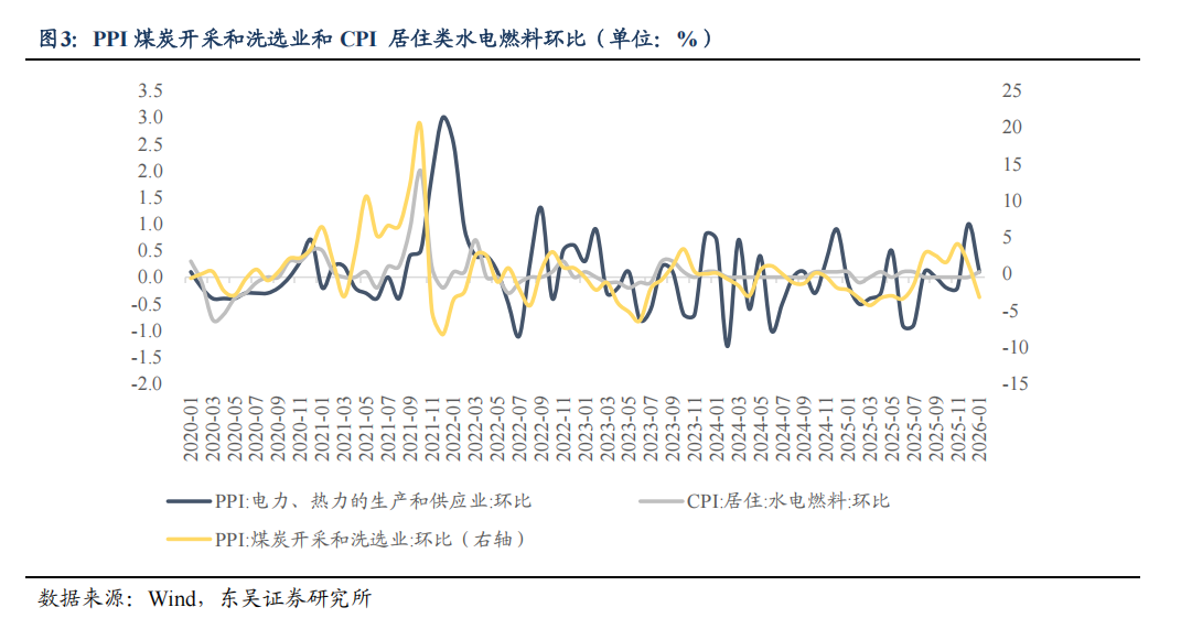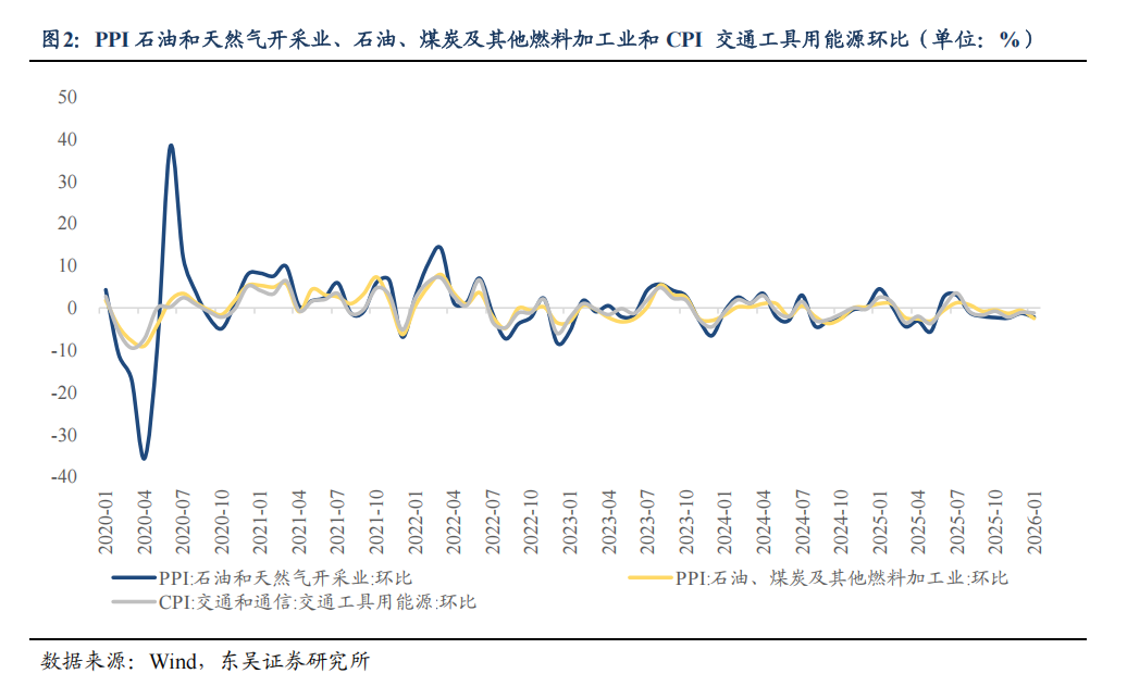 PPI如何直接影响CPI小类的变动?(1)石油化工产业链:上游由 “石油和天然气开采业”提供原油原料,中游通过 “石油、煤炭及其他燃料加工业”完成成品油炼制,下游终端零售环节虽无直接对应PPI大类,但其中游出厂价格与CPI交通工具用能源价格联系紧密。具体来看,国际油价波动带动国内石油天然气开采价格变动,中游化工行业将成本变动传导至成品油等中间产品,下游交通燃油零售企业根据中间产品价格调整终端售价,从而形成对 CPI 相关分项的拉动。从2020年至2026年1月的PPI石油和天然气开采业和CPI 交通工具用能源环比数据的相关系数来看,CPI交通工具用能源环比和上游PPI石油和天然气开采业环比的相关系数为0.7236,CPI交通工具用能源环比和中游石油、煤炭及其他燃料加工业的相关系数为0.9000,上游PPI石油和天然气开采业环比和中游石油、煤炭及其他燃料加工业的相关系数为0.7447。车用燃料小类与 PPI 成品油价格传导几乎无滞后,关联性达80%,成品油价格受国际油价影响直接且调价机制相对透明。(2)煤炭-电力产业链:以煤炭-电力产业链中的水电燃料的生产销售为例,选取PPI、CPI对应的分项:PPI煤炭开采和洗选业和CPI 居住类水电燃料来分析,上中下游的传导路径为:煤炭开采和洗选业➡电力、热力的生产和供应业➡居住类水电燃料。从2020年至2026年1月的PPI煤炭开采和洗选业和CPI 居住类(水电燃料小类)数据的相关系数来看,CPI居住水电燃料环比和PPI煤炭开采和洗选业环比、PPI电力、热力的生产和供应业环比的相关系数分别为0.6496、0.1912。从传导效果来看,传导整体效率中等。由于电力作为基础能源,其价格调整受政府限价政策严格管控,因此PPI 煤炭开采价格波动对CPI 水电燃料小类的直接传导作用有限,存在较强政策约束。仅当煤炭价格长期大幅上涨、政府启动电价疏导机制时,才可能观察到CPI水电燃料价格小幅回升;在政策调控常态化下,上游煤炭价格变动对终端消费价格的传导多被中间环节消化。(3)农产品产业链:以农产品加工链中粮食、畜肉类为例,上中下游的传导路径为:谷物、畜产品等农业原料➡PPI农副食品加工业➡PPI食品制造业➡CPI食品烟酒类中的粮食、畜肉类。农产品加工产业链中上游农业原料虽无直接对应的PPI大类,但农业原料价格是成本源头。上游农产品原料价格变动直接影响中游食品加工企业生产成本,进而影响下游食品类售价,最终带动CPI食品烟酒类中的粮食、畜肉类价格变动。从传导效果来看, PPI 农副食品加工业价格同比变动与 CPI 食品烟酒类中的畜肉类、粮食的变动相关度达50%-60%。其中,畜肉类传导更为直接。2020年至2026年1月的数据显示,PPI农副食品加工业环比和CPI食品烟酒畜肉类环比、CPI食品烟酒粮食环比的相关系数分别为0.5626、0.4824。(4)有色金属产业链:以有色金属产业链为例,选取PPI、CPI对应的分项,上中下游的传导路径为:PPI有色金属矿采选业➡PPI有色金属冶炼和压延加工业➡PPI金属制品业/PPI电气机械和器材制造业➡CPI家用器具。从传导效果来看,有色金属产业链呈现出上游强、中游良好、下游分化偏弱、强度递减的特征。2020年至2026年1月的数据显示,PPI有色金属矿采选业和PPI有色金属冶炼和压延加工业的相关系数为0.7122,PPI 有色金属冶炼和压延加工业和PPI 电气机械和器材制造业、PPI 金属制品业的相关系数分别为0.5920、0.6166,PPI电气机械和器材制造业、PPI金属制品业和CPI家用器具的相关系数分别为0.0367、0.1194。