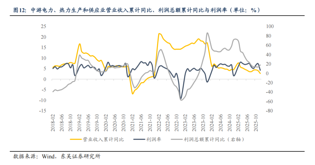 中游电力、热力生产和供应业行业利润提升具备显著的政策触发型特征,在电价疏导机制启动前,成本压力难以转嫁,盈利承压。从收入端来看,电价受政府限价政策严格管控,煤炭价格上涨无法直接推动电价同步上调,营业收入仅能依靠发电量增长实现小幅增长,营收累计同比保持低位波动,缺乏价格上涨的驱动。从利润率端来看,在电价疏导机制启动前,上游煤炭涨价带来的成本压力只能由电力企业自行消化,从而导致企业利润率偏低。但当政府启动电价疏导机制后,电价小幅上调有效疏导成本压力,利润总额和营业收入实现增长,利润率实现小幅改善,结束盈利承压态势。即中游电力行业作为民生基础行业,利润改善不完全依赖市场价格联动,而与政策高度相关,是典型的政策触发型盈利改善行业。
