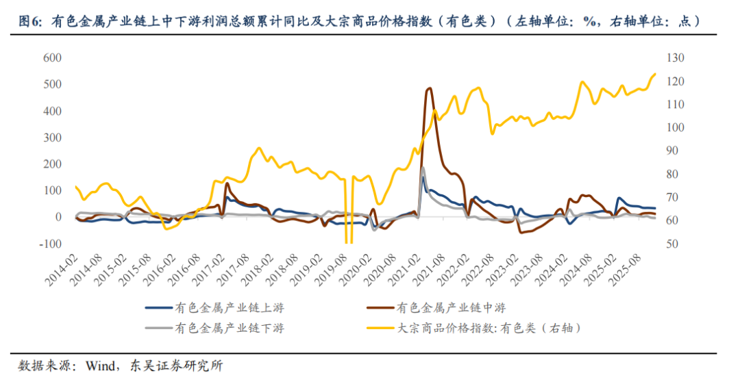 有色金属产业链是物价回升期盈利弹性最大的领域之一,大宗商品价格上涨(2025 年6-12月大宗商品价格指数有色类从115.69升至127.6)直接带动全链条价格联动,上中下游利润增长呈现“上游领涨、中游跟随、下游受制”特征。