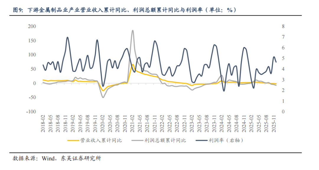 中游有色金属冶炼和压延加工业承接上游矿产涨价,并向下游传递成本压力。数据显示,中游销售利润率从2018年的2.68%逐步提升至2025年的4.13%,利润总额累计同比随上游价格上涨同步走高。理论上,中游行业集中度较高,下游需求刚性,成本转嫁率较高,这成为中游产业利润跟随增长的关键支撑。从收入端看,铜材、铝材等加工品价格与上游矿产价格联动性强,上游矿产涨价可快速传导至中游加工品出厂价,推动营业收入稳健增长,营收累计同比与上游保持一致走势;从利润率端来看:中游的规模效应与高成本转嫁能力形成双重支撑,一方面行业集中度高赋予企业较强的定价权,可将上游成本压力顺畅向下游转嫁;另一方面加工环节的规模效应摊薄单位成本,叠加下游家电、新能源、机械制造的刚性需求,利润率实现稳步提升。总的来说,中游作为产业链的“加工转化环节”,价格传导效率良好,盈利弹性虽弱于上游,但仍能实现收入与利润的双增长,是产业链利润增长的重要承接环节。