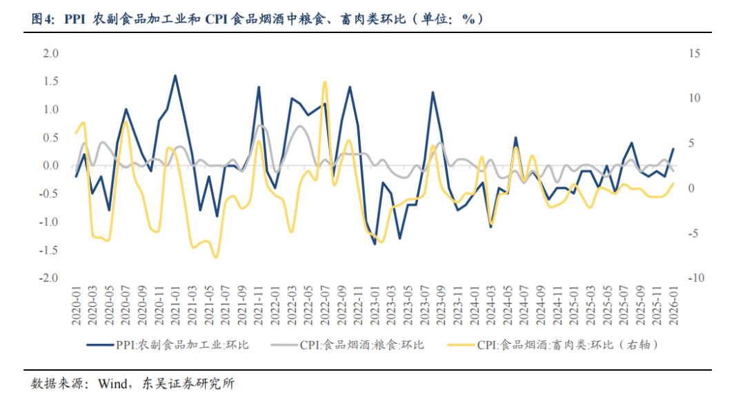 从传导效果来看, PPI 农副食品加工业价格同比变动与 CPI 食品烟酒类中的畜肉类、粮食的变动相关度达50%-60%。其中,畜肉类传导更为直接。2020年至2026年1月的数据显示,PPI农副食品加工业环比和CPI食品烟酒畜肉类环比、CPI食品烟酒粮食环比的相关系数分别为0.5626、0.4824。