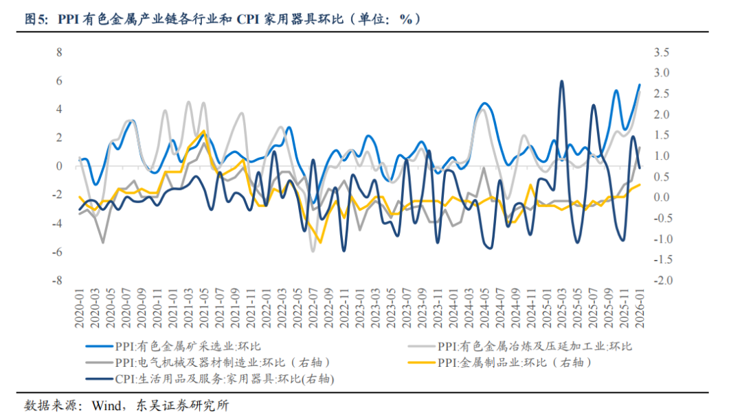 大宗商品涨价对 PPI 的拉动效果显著,CPI 传导呈现结构性特征:2025年8月以来,以有色金属为代表的大宗商品价格持续回暖直接带动PPI连续8个月改善,上游采掘业与中游原材料加工业成为PPI 回升的核心驱动。但 PPI 向 CPI 的传导并非全面同步,呈现“刚性需求品类顺畅、非刚性品类阻滞”的结构性特征。