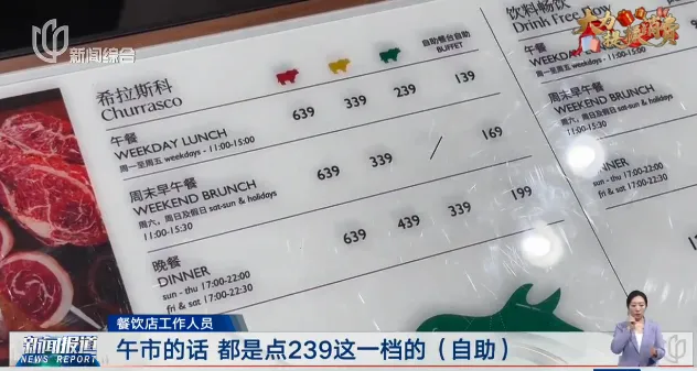 餐饮店工作人员:年轻人的话,可能点189元的套餐会比较多一点。年轻人特别多,午市的话,都是点239这一档的自助。